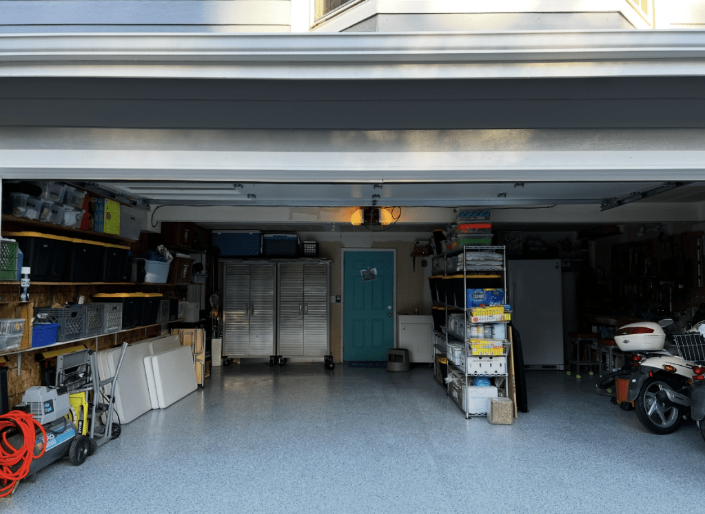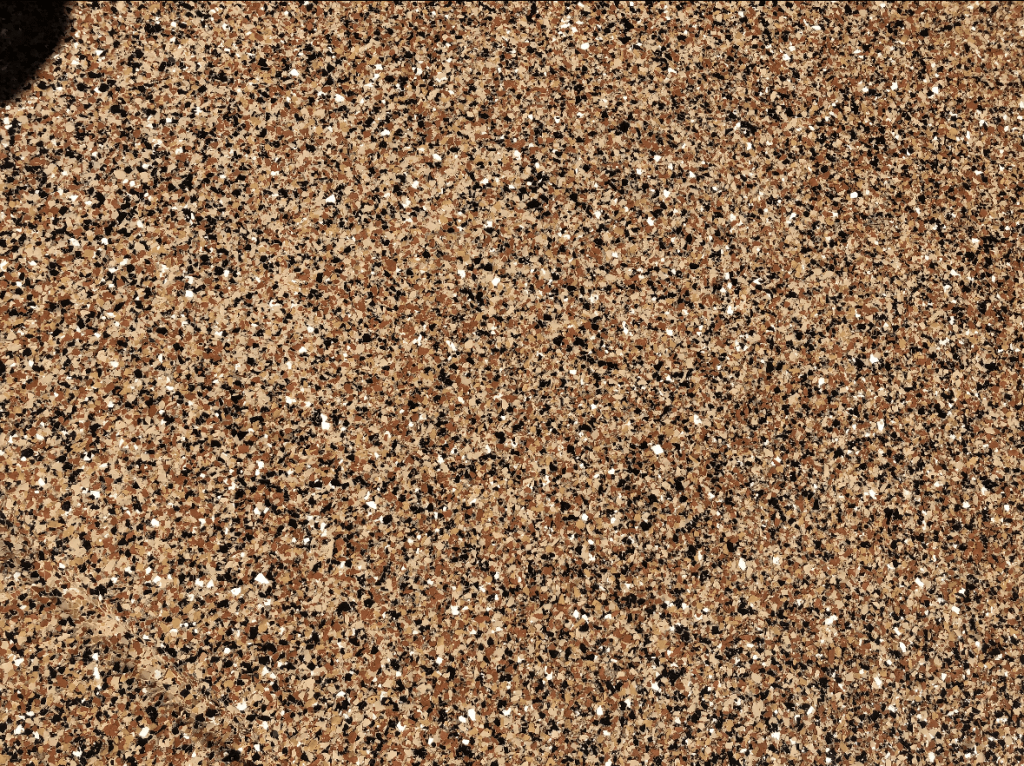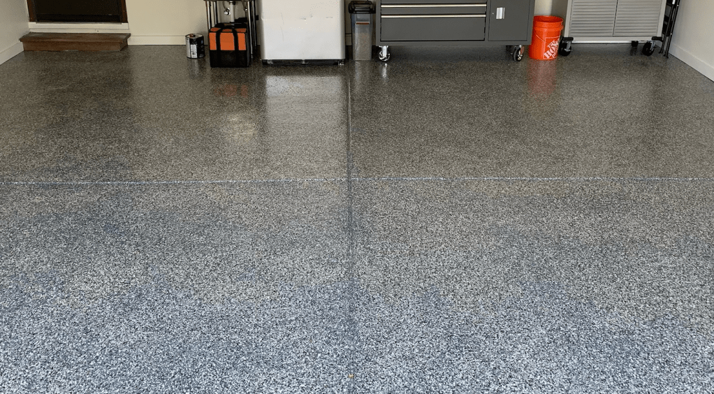 - a clear coat of polyaspartic to lock in the flakes and evenly finish the space
